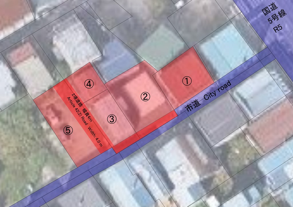 敷地内には以下の建物(4棟)と空き地があります。 ①住宅兼作業場(1階が作業場、2階が住居用スペースとなります。構造:コンクリートブロック・木造亜鉛メッキ鋼板葺2階建、延床面積:194.58㎡、1992年築) ②ガレージ(構造:鉄板造鉄板屋根平屋建、延床面積:60.78㎡、2022年築) ③戸建(構造:軽量鉄骨造陸屋根3階建、延床面積:149.9㎡、1986年7月築) ④古屋(構造:木造亜鉛メッキ鋼板葺2階建、延床面積:84.45㎡、築年不明) ⑤空き地 ※敷地図の赤の部分は売買の対象ですが、道路用地のため使用できません。 |